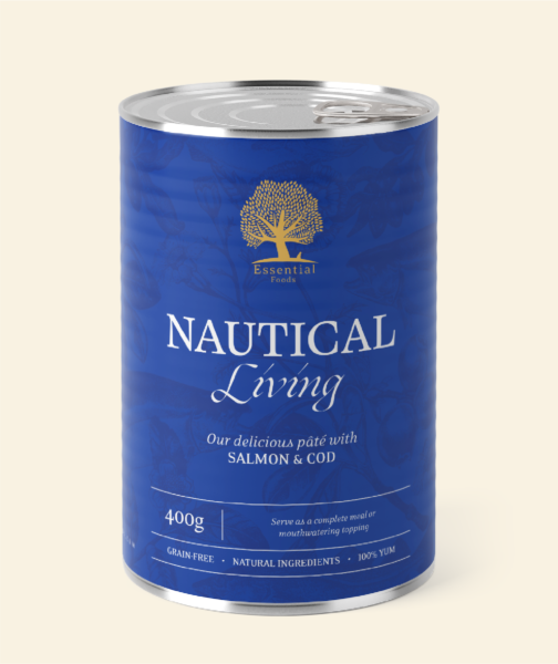 ESSENTIAL NAUTICAL LIVING PÂTÉ er vores lækre paté med laks og torsk for voksne hunde. Den kan serveres som et fuldfoder måltid, men går lige så godt som en appetitvækkende topping. Patéen er kornfri, med fisk som den absolut primære ingrediens og udelukkende tilberedt med naturlige ingredienser. Et sandt hit hos fiskeelskere! Mængderabat: 1 stk. 35,-  køb 6 stk. og spar 5% - Mix Gerne mellem de øvrige Essential Pâté varianter.