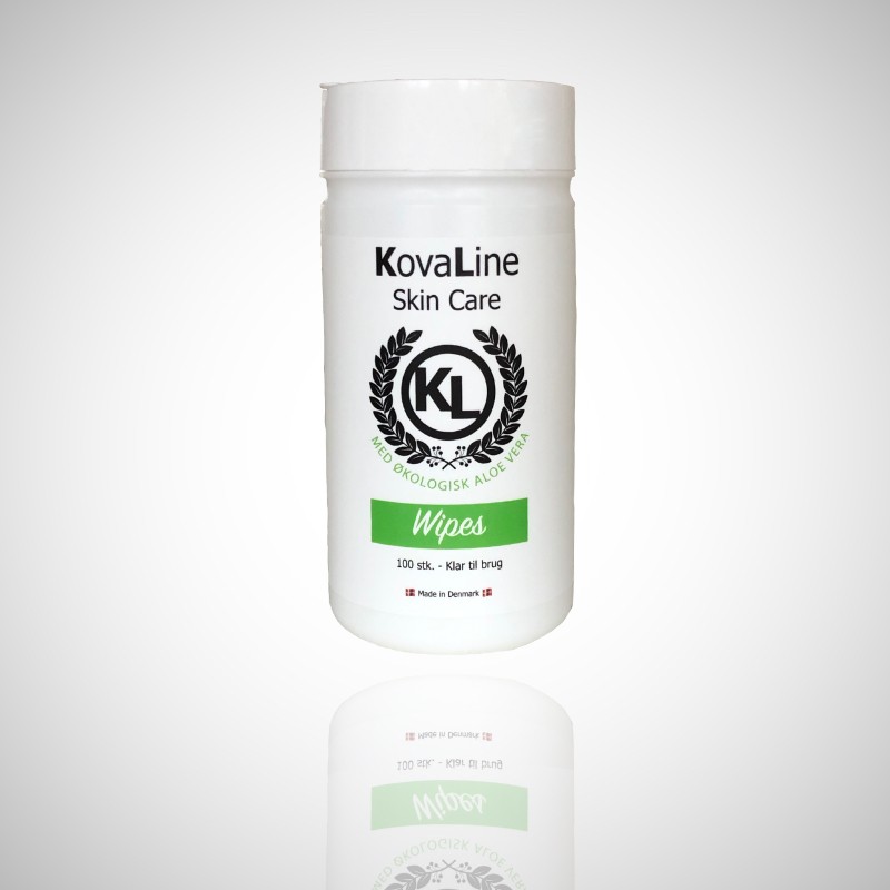 KovaLine Wipes 100 stk. Klar til brug med 50% Aloe Vera, økologisk. KL Wipes Aloe Vera indeholder vores KovaLine Plejeblanding Ready To Use, samt 50% Aloe Vera, økologisk. Renser, peeler og plejer i samme proces.