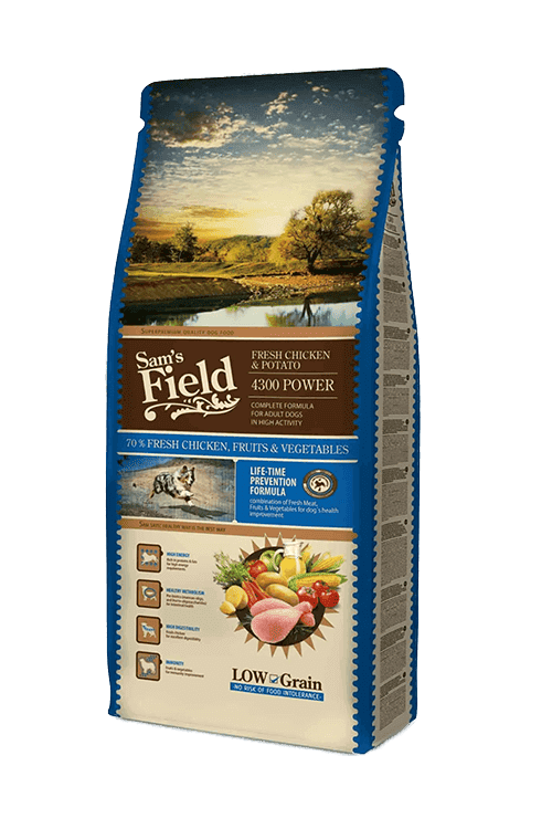 Sam’s Field 4300 Power er et premium fuldfoder til voksne hunde med et stort energibehov. Hundefoderet har et ophøjet indhold af protein og fedt, som hjælper på hundens muskler og væv, når aktivitetsniveauet er højt.