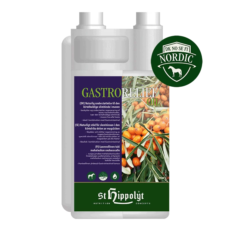 Gastro-serien Nordisk serie med havtornsmacerat Gastro-serien består af fiberfoderet Gastro Relief Beet, olien Gastro Relief Oil og fordøjelsestilskuddet GastroIntestinal. Serien er udviklet til at hjælpe hestens fordøjelse og er målrettet heste med følsomme maveslimhinder. Fibre og olier virker plejende mens andre ingredienser, især havtornsmacerat, virker styrkende og regenererende på mavesækken. Havtorn er afprøvet i et videnskabeligt godkendt forsøg i 2012 med navnet ”Effect of Sea Buckthorn Berries and Pulp in a Liquid Emulsion on Gastric Ulcer Scores and Gastric Juice pH in Horses”. I forsøget deltog 8 heste i et forløb over 2 x 5 uger med 2 ugers pause imellem. De blev fodret med pelleteret foder og i den anden periode tillige med havtorn. I den 5. uge i hver periode blev hestene stressfodret, dvs. kun fodret hver anden dag. Dog fik de havtorn hver dag i denne uge i anden periode. Hestene blev undersøgt gennem gastroskopi på dag 0, dag 28 og dag 35, efter stressfodringsugen, hvor pH værdien i mavesaften blev målt og graden samt antallet af slimhindeirritationer i henholdsvis den hvide og den røde del af mavesækken blev noteret. Resultaterne var overraskende og spændende, især observationerne af slimhindeirritationer i den røde del af mavesækken. Her sås det, at irritationerne fra forsøgets start forsvandt hen over 4-ugersperioden, hvor hestene fik havtorn som tilskud hver dag og forblev væk, under den efterfølgende stressfodringsperiode. Det påvistes således, at havtorn har en stor effekt på maveslimhinden. Ved at tilsætte Gastro-seriens produkter havtornsmacerat bliver de helt særlige i deres effektivitet. De øvrige udvalgte ingredienser bidrager alle målrettet til en fordøjelse i balance og et optimeret stofskifte. Seriens produkter er løsningsorienterede indenfor fordøjelse hver for sig eller i kombination – også med andre St. Hippolyt-produkter.