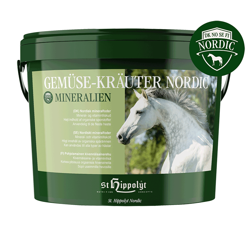 Pelleteret mineralfoder tilpasset behovene i de nordiske lande. Gemüse-Kräuter-Mineralien Nordic indeholder alle de vigtige mineraler, sporstoffer og vitaminer, som skal være i en god fodring. Tørrede grønsager, frugt, oliefrø og urter giver god smag, god fordøjelighed og efterfølgende en høj optagelighed.