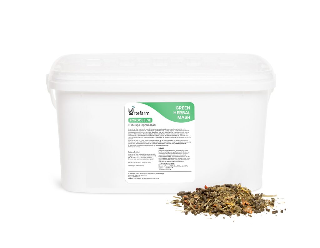 Green Herbal Mash er en 100% kornfri urtemash, der er lav på sukker og stivelse (stivelse <1,6 % og sukker 4,9 %). Green Herbal Mash anvendes til alle heste, der skal have et lækkert måltid. Produktet er sammensat med tanke på hestens naturlige næringskilder fra let fordøjelige fibre. Produktet er desuden godt til heste med tandproblemer og understøtter en sund tarmflora. Green Herbal Mash kan udfordres i koldt eller lunkent vand (Max. 35 grader). Tilskuddet erstatter ikke hestens daglige fodder.